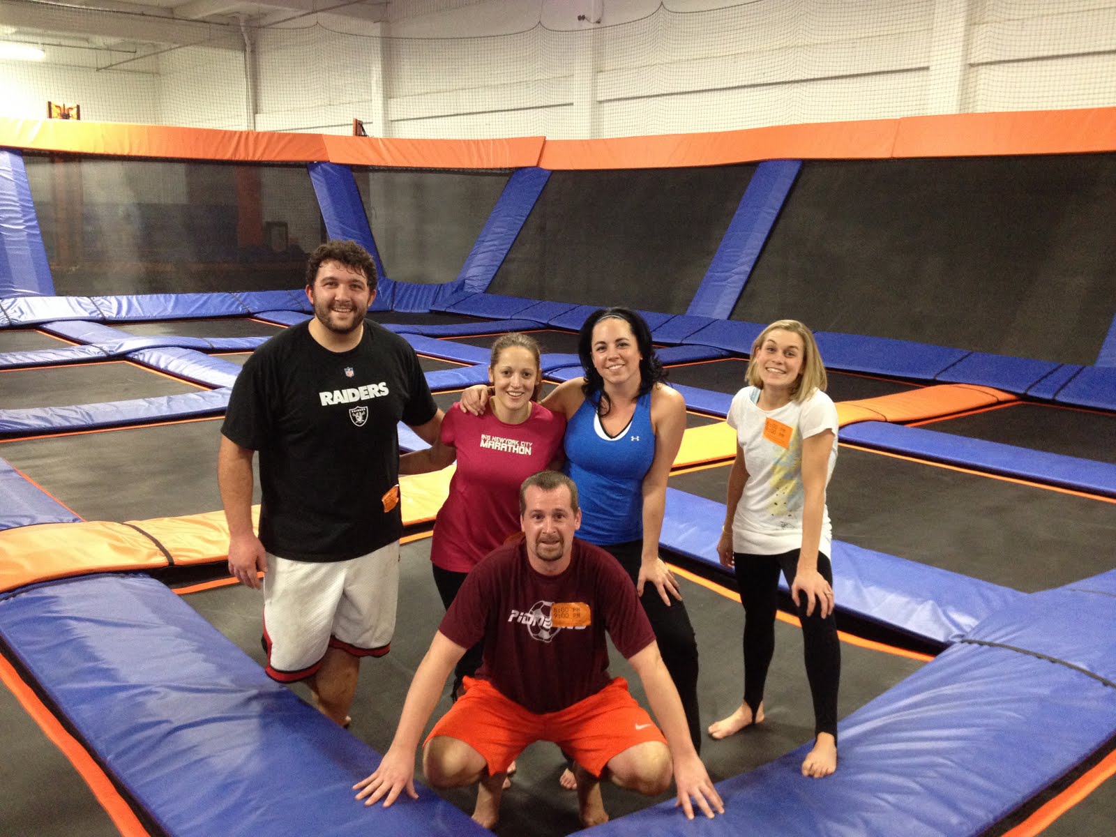 The wolf pack tried out the new trampoline place, Sky Zone, in K-town on Friday (Grand Opening is 12/10). We lucked out and had the ENTIRE place to ourselves and paid $11 each to jump for an hour, which was plenty of time to get your workout on. The music could have been louder and the refs could have been a bit less anal about their long list of rules (come on guys, we’re almost 30 – we can jump and not hurt ourselves – sheesh.), but overall another fun option for entertainment. Not sure how I’d feel with a bunch of other peeps/kids there, but word on the street is that they’re working on jump aerobics classes – sign me up!