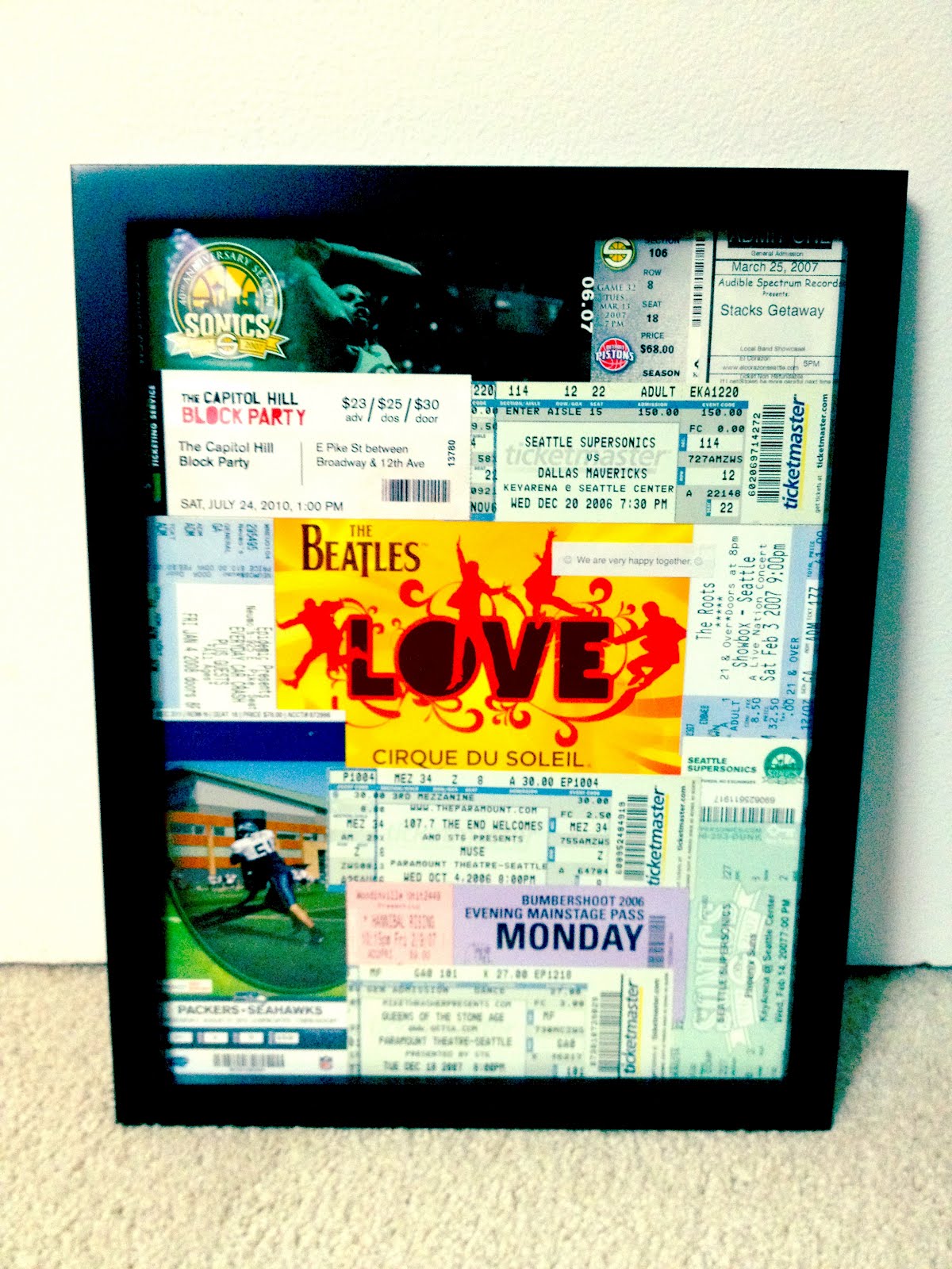 My latest pin projects (above) included creating wall art using ticket stubs that the BF and I had seen together; it was like a walk down memory lane! I probably could have made 3 or 4 of these with the amount of shows we’ve seen! I handpicked the ‘best of the best’ including the Sonics ticket the night he told me he loved me. Yes, a true romantic at heart – nothing says I love you more than the NBA š If you know our household, you know just how true this is.